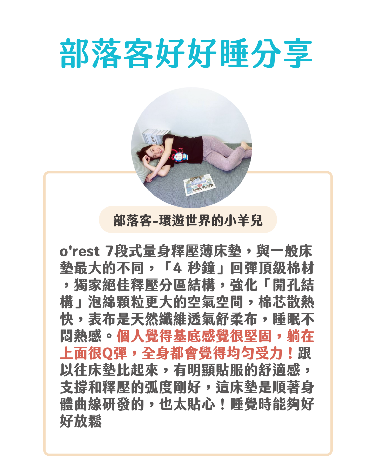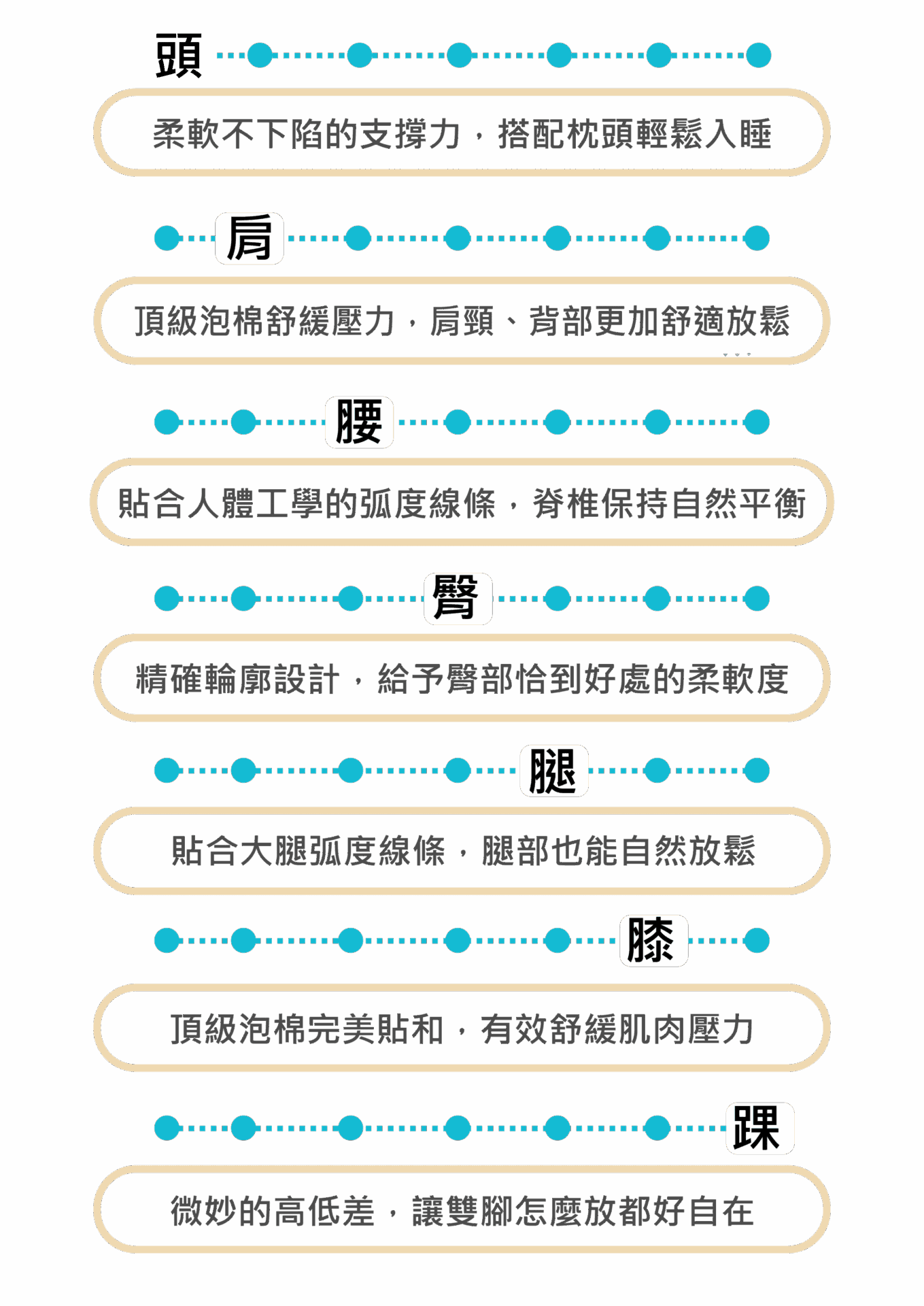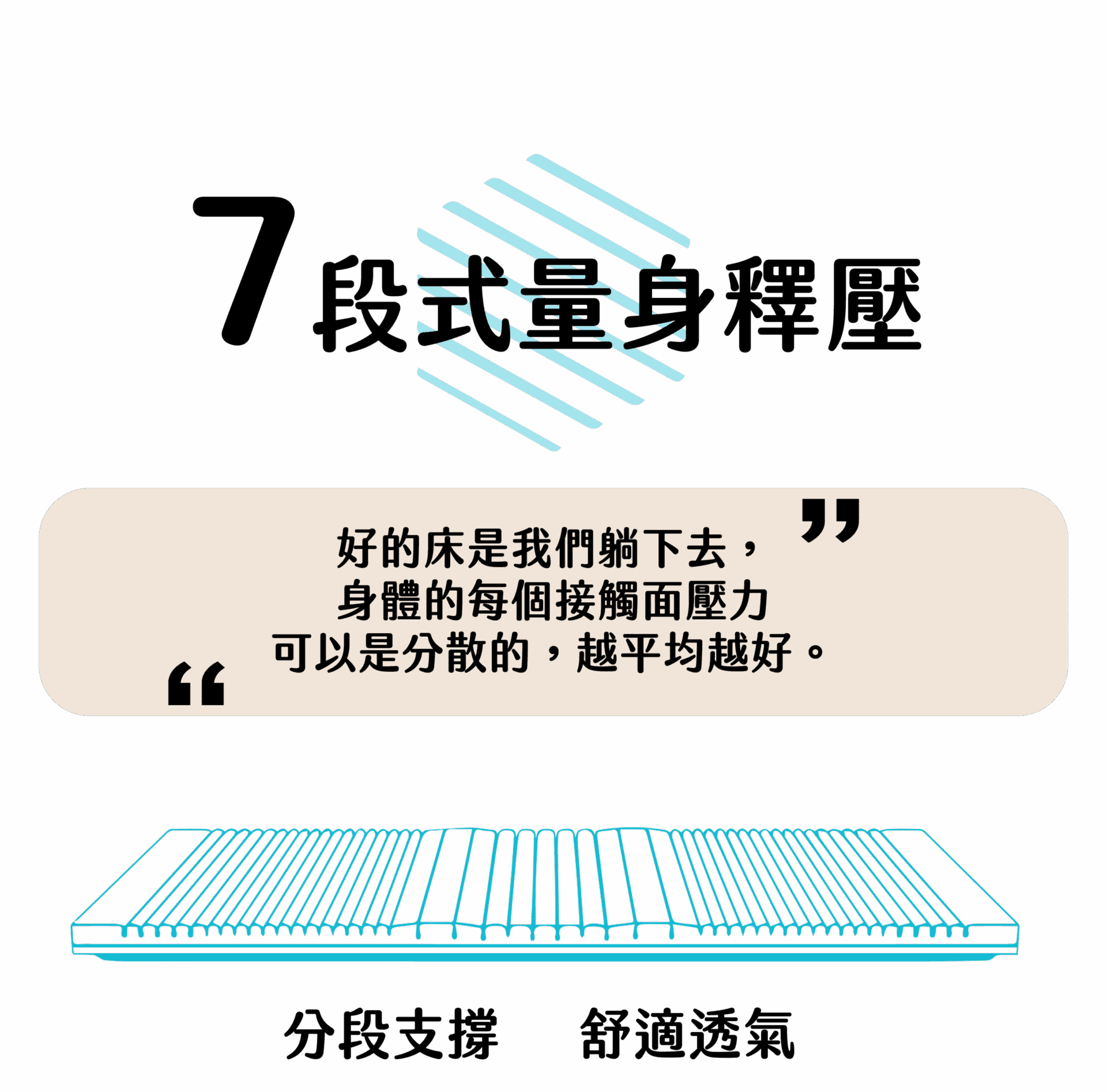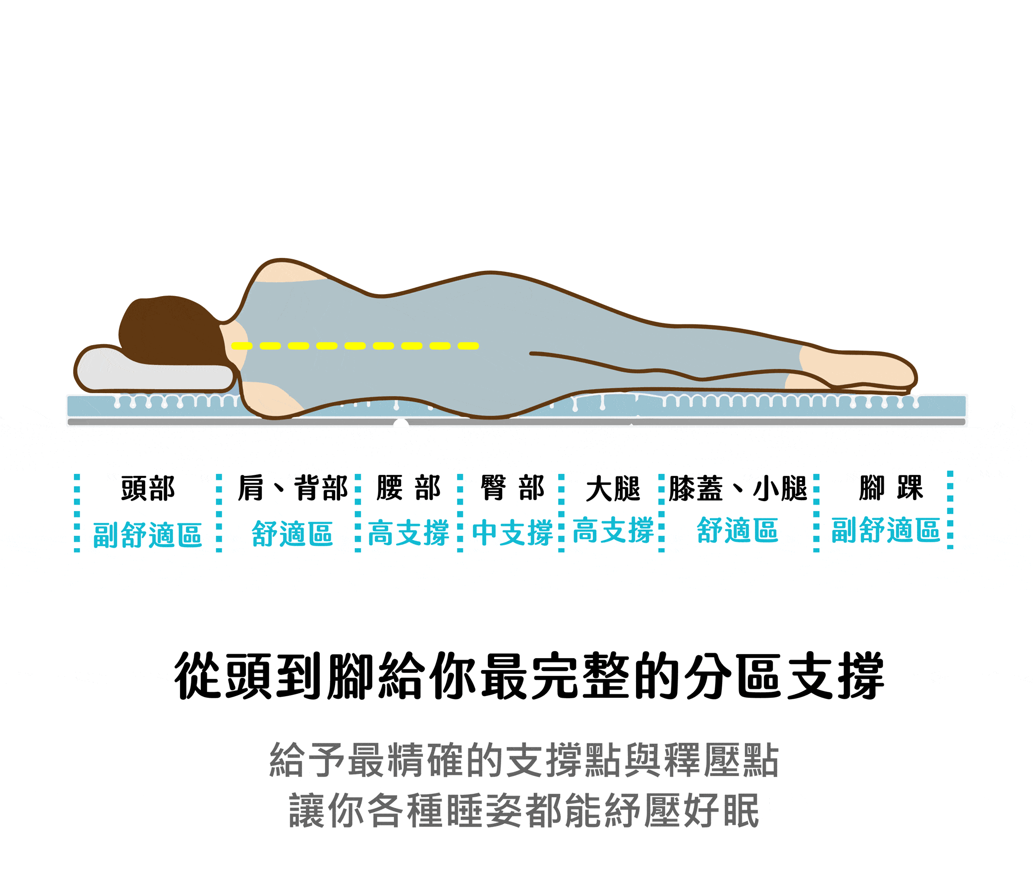 o’rest 輕薄版 7 段式量身釋壓床墊針對從頭到腳的7個關鍵部位,採用人體工學分區結構設計,幫助您在睡眠時,提供身體精確的支撐及壓力舒緩.