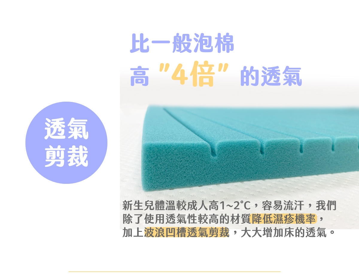 o’rest Q-Pad 天絲透氣可水洗兒童床墊 – 針對小寶寶人的需求設計,裁切出凹槽結構設計,幫助寶寶在睡眠時,提供身體精確的支撐,以及完美的高透氣性。